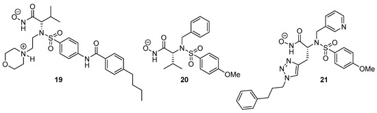 - Rossello, A.; Nuti, E.; Orlandini, E.; Carelli, P.; Rapposelli, S.; Macchia, M.; Minutolo, F.; Carbonaro, L.; Albini, A.; Benelli, R. New N-arylsulfonyl-N-alkoxyaminoacetohydroxamic acids as selective inhibitors of gelatinase A (MMP-2). Bioorg. Med. Chem. 2004, 12, 2441–2450. [Google Scholar] [CrossRef]