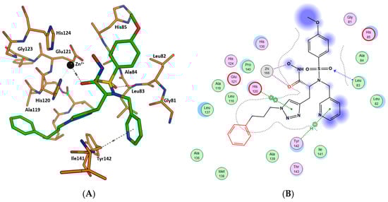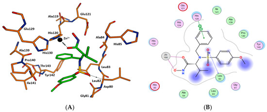 The docking results of 20 show the compound forming a number of contacts to the catalytic Zn2+ ion and surrounding amino acids in a similar manner as for CGS-27023A (Figure 3A,B). The hydroxamate oxygen atom and carbonyl functional group form a bidentate interaction with active site Zn2+ (Figure 3). This key interaction is stabilized by additional interactions with side chains of His 120 and His 130. One hydrogen bond is formed between sulfone moiety and Leu 83 on the protein’s backbone (Figure 3A). The longer hydrophobic 4-methoxybenzene tail protrudes deeply into the S1′ subsite, which is in an open conformation. The capacity of the P1′ pocket to accommodate such large moieties as the 4-methoxybenzenesulfonate is rather remarkable and demonstrates that the pocket is both flexible and open at the bottom. The isopropyl group in 20 extends into the solvent, and altering this group should therefore have little impact on the potency of MMP-2. On the other hand, the benzyl moiety occupies a smaller S2′ subsite of the enzyme, which further stabilizes binding through additional hydrophobic interactions with His 120. The binding poses of 20 to MMP-2 were compared with the binding mode of CGS-27023A. The key bidentate interaction with Zn2+ in the active site, as well as the hydrogen bond with sulfone moiety, were also observed in the binding of CGS-27023A with MMP-2 (PDB: 1HOV).