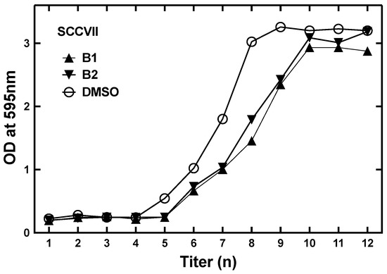 BNCT efficacy is demonstrated in SCC VII cells (Figure 6) and in U87 glioma cells (Figure 7). The survival fraction of 1 (B1) and 2 (B2) in a pre-incubation boron concentration at 0.143 ppm 10B and 0.101 ppm 10B, respectively, were similar (Figure 6). The IC50 values of 1 and 2 (B1 and B2) were determined to be 2.04 × 10−2 mg/mL and 2.67 × 10−2 mg/mL, respectively. These values recommend further in vitro/in vivo studies. The IC50 of BPA is 2.55 × 10−2 M (Figure 5).