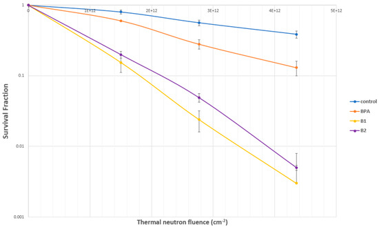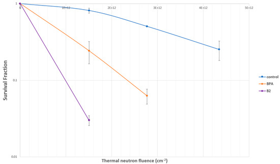 Cell survival curves for glioma U87 delta EGFR cells after BNCT with hydroxamate 2 (B2).