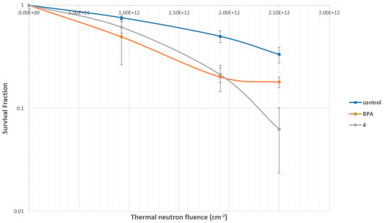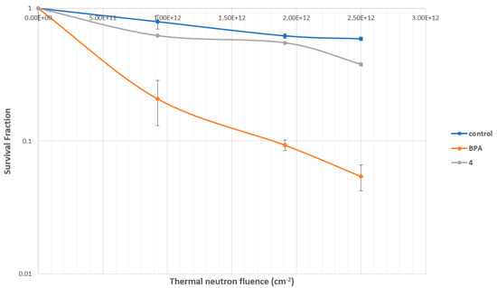Survival fraction in SCC VII cells. BPA: 20 ppm 10B; compound 4: 0.48 ppm 10B treated with SCC VII cells for 4 h.