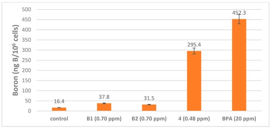 The survival fraction in U87 glial cells treated with MMP carborane 4 with BPA as a standard is shown in Figure 8, and the survival fraction in SCC VII cells is shown in Figure 9. In U87 MG delta EGFR cells, cell killing effects were similar between MMP carborane 4 and BPA, although the 10B concentration in medium was 41.6 times higher in the BPA compared with the MMP carborane 4 (BPA: 20 ppm 10B and MMP carborane 4: 0.48 ppm) (Figure 8). On the other hand, in SCC VII cells, the cell killing effect was much lower in the MMP carborane 4 than in the BPA at the treatment dose in medium (BPA: 20 ppm 10B and MMP carborane 4: 0.48 ppm) (Figure 9). Investigation of the cellular concentration of 10B may explain the difference of the two cell lines, therefore, we investigated the cellular concentration of boron by ICP-OES in Figure 10 and Figure 11 as well as of 1 (B1) and 2 (B2).