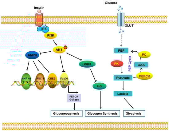 Recently, an increasing number of studies have believed that an abnormal glucose metabolism is the central link to hyperglycemia in diabetic patients [8]. The blood glucose level depends on the dynamic balance between glucose consumption and production. Glucose production mainly comes from gluconeogenesis and hepatic glycogen decomposition, while glucose consumption partly depends on the utilization of peripheral tissues [54]. The liver is the main organ that maintains the balance of glucose metabolism and plays a core role in the pathogenesis of diabetes [44]. Phosphoinositide 3-kinase (PI3K)/Akt is the key pathway for the liver’s response to insulin [55]. Upon insulin engagement of its cognate receptor, PI3K is recruited to insulin receptor substrates (IRSs), which activates PI3K activity. PI3K activation produces phosphorylated phosphatidylinositol 3 (PIP3) at the plasma membrane, which binds to the intracellular PH domain-containing signaling proteins Akt and PDK1, prompting PDK1 to phosphorylate Akt proteins leading to their activation, which in turn regulates downstream proteins. Akt further phosphorylates and deactivates its target genes and signals to multiple downstream pathways to control the glucose level through gluconeogenesis and/or glycogen synthesis (Figure 1). One of the key target genes of Akt is glycogen synthase kinase-3 (GSK3), which is phosphorylated by Akt and thereby the phosphorylation of glycogen synthase (GS), resulting in the inactivation of GS activity and reduction of glycogen synthesis. Akt also blocks gluconeogenesis by promoting the phosphorylation and degradation of forkhead transcription factor 1 (foxo1) and downregulating the expression of phosphoenolpyruvate carboxykinase (PEPCK) and glucose-6-phosphatase (G6Pase), which are the rate-limiting enzymes [56] (Figure 1).