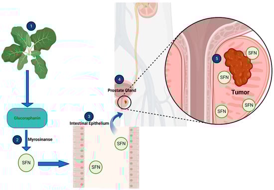 A Synopsis of the Action of Sulforaphane (SFN) on Prostatic Tumor. (1) The raw or boiled Cruciferous vegetable is chopped, chewed and eaten. (2) Myrosinase converts glucoraphanin to SFN. (3) SFN is absorbed and transported into the blood stream. (4) SFN accumulates in prostate tumor tissues. (5) SFN acts on the tumor. This illustration was made with Biorender.com (accessed on 22 February 2023).