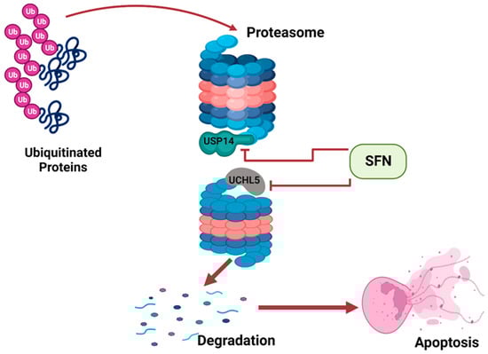 Sulforaphane has been shown to inhibit the two proteasomal cysteine DUBs, USP14 and UCHL5, in prostate cancer cells [16]. Sulforaphane interacts with USP14 and UCHL5 and suppresses their activity. This promotes increased degradation and induces apoptosis of cells of prostate tumor tissue (Figure 3).