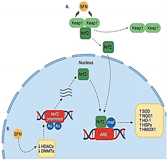 Effect of SFN on Nrf2/Keap1 pathway. (A) SFN modifies Keap1 cysteine residues, causing release of Nrf2, which allows it to translocate to the nucleus. (B) SFN also induces epigenetic modulation of HDACs and DNMTs, causing increased Nrf2 transcription and translation [5].