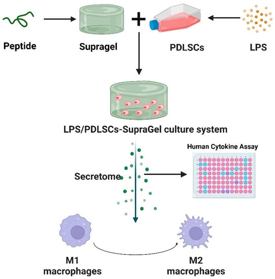 Schematic diagram of 3D-cultured LPS-pretreated PDLSC-derived secretome on macrophage polarization; created with BioRender.com (accessed on 27 March 2023).