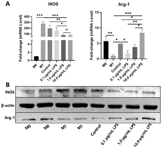 Effect of CM derived from LPS-pretreated PDLSCs on macrophage polarization. (A) qRT-PCR: iNOS and Arg-1 mRNA expression in M1 macrophages after culturing with CM derived from 0 (Control), 0.1, 1.0 and 10.0 μg/mL LPS-pretreated PDLSCs. (B) Western blot: iNOS and Arg-1 protein expression in M1 macrophages after culturing with CM derived from 0 (Control), 0.1, 1.0 and 10.0 μg/mL LPS-pretreated PDLSCs. * p < 0.05; ** p < 0.01; *** p < 0.001.