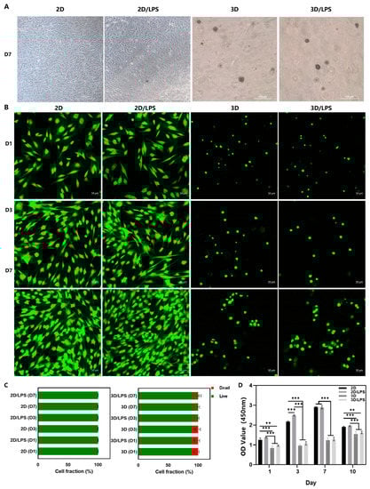 Growth, viability and proliferation of PDLSCs in SupraGel. (A) Morphology of PDLSCs and LPS-pretreated PDLSCs under light microscope; scale bar—100 μm. (B) Live/Dead image under laser scanning confocal microscope; scale bar—50 μm, green—live cells, red—dead cells. (C) Semi-quantitative analysis of the Live/Dead assay. (D) CCK8 proliferation assay of PDLSCs and LPS-pretreated PDLSCs after culturing in culture plates and SupraGel on days 1, 3, 7 and 10. 2D—PDLSCs in cell culture plate; 2D/LPS—LPS-pretreated PDLSCs in cell culture plate; 3D—PDLSCs in SupraGel; 3D/LPS—LPS-pretreated PDLSCs in SupraGel. D1—Day 1; D3—Day 3; D7—Day 7. ** p < 0.01; *** p < 0.001.