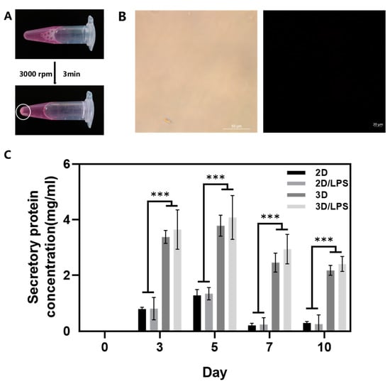 Collection and protein concentration measurement of secretome. (A) Separation of PDLSCs and SupraGel by adding PBS and centrifugation; white circle shows cell deposits. (B) Images of the supernatant after centrifugation. Left: light microscope image; scale bar—50 μm; Right: Live/Dead image; scale bar—20 μm. (C) Secretory protein concentration of 2D-, 2D/LPS-, 3D- and 3D/LPS-group-derived secretome on days 0, 3, 5, 7 and 10. *** p < 0.001.