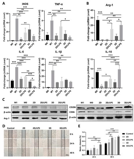 Effects of the secretome on macrophage polarization and migration. (A) qRT-PCR: iNOS, TNF-α, IL-6 and IL-1β mRNA expression in M0, M1 and 2D-, 2D/LPS-, 3D-, 3D/LPS-group-derived-secretome-cultured M1 macrophages. (B) qRT-PCR: Arg-1 and IL-10 mRNA expression in M0, M1 and 2D-, 2D/LPS-, 3D- and 3D/LPS-group-derived-secretome-cultured M1 macrophages. (C) Western blot: iNOS, Arg-1, CD86 and CD206 expression in M0, M1 and 2D-, 2D/LPS-, 3D-, 3D/LPS-group-derived-secretome-cultured M1 macrophages. (D) Wound healing of macrophages cultured with FBS-free medium (Control) and 2D-, 2D/LPS-, 3D- and 3D/LPS-group-derived secretome for 0, 24 and 48 h under a microscope; scale bar—500 μm. (E) Wound closure of macrophages cultured with FBS-free medium (Control) and 2D-, 2D/LPS-, 3D-, 3D/LPS-group-derived secretome for 0, 24 and 48 h. * p < 0.05; ** p < 0.01; *** p < 0.001.