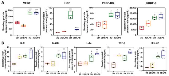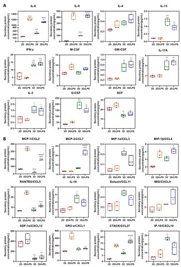 We performed an immune cytokines assay (48 cytokines) on 2D-, 2D/LPS-, 3D- and 3D/LPS-group-derived secretome to study whether the different treatments translated into an altered paracrine content in the corresponding secretome. The expression levels of different cytokines are summarized in Figure 8 and Figure 9 and Figure S3. Of the 48 cytokines examined, 32 significantly changed after LPS and/or 3D culture treatment. Firstly, the secretion of IL-6, IL-8, IL-4, IL-13, IL-17, M-CSF, IFN-γ and GM-CSF involved in macrophage polarization significantly increased in PDLSCs after LPS and/or 3D culture treatment (Figure 8A). IL-4 increased in the 3D/LPS-group-derived secretome, IL-13 increased in 3D- and 3D/LPS-group-derived secretome, while IL-6 and IL-8 increased in 2D/LPS-, 3D- and 3D/LPS-group-derived secretome, especially in the 2D/LPS and 3D/LPS groups. Another cytokine that increased in PDLSCs after 3D culture is IL-17A. In addition, M-CSF increased in the 2D/LPS-group-derived secretome and GM-CSF increased in the 3D- and 3D/LPS-group-derived secretome. Meanwhile, significant changes in the expression of G-CSF, IL-3, SCF in PDLSCs were observed after pretreatment (Figure 8A). The production of G-CSF and IL-3 increased and SCF decreased in the 3D-cultured PDLSC-derived secretome. The secretion of multiple chemokines significantly changed in PDLSC-derived secretome after LPS pretreatment and/or 3D culture (Figure 8B). MCP-1 increased in 2D/LPS- and 3D/LPS-group-derived secretome but decreased in the 3D-group-derived secretome, and MCP-3 and MIG increased in the 3D/LPS-group-derived secretome. MIP-1α and Eotaxin increased in the 3D-group-derived secretome. 3D culture promoted the secretion of IL-16 and IP-10 in PDLSCs, while LPS pretreatment promoted the expression of RANTES and GRO-α in PDLSCs. MIP-1β and CTACK secretion by PDLSCs increased after LPS and/or 3D culture treatment. The secretion of SDF-1α by PDLSCs decreased after 3D culture. In addition, we noticed that after 3D culture, the expression of VEGF, HGF, PDGF and SCGF-β increased in PDLSC-derived secretome (Figure 9A). In addition to the aforementioned cytokines, IL-9 increased in 2D/LPS-, 3D- and 3D/LPS-group-derived secretome and IL-2Rα increased in 3D- and 3D/LPS-group-derived secretome. The inflammatory cytokines IL-1α and IFN-α2 increased in 3D- and 3D/LPS-group-derived secretome, and TNF-β increased in 2D/LPS- and 3D/LPS-group-derived secretome (Figure 9B).