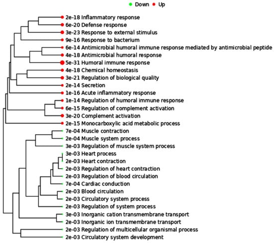 Gene ontology classification of genes according to biological processes. Red dots denote upregulation, and green dots denote downregulation.