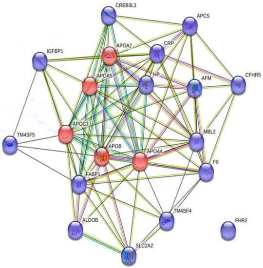 Protein-protein interactions (PPI) among the top 20 upregulated genes retrieved from the STRING database. Genes belonging to the apolipoprotein family are in red.
