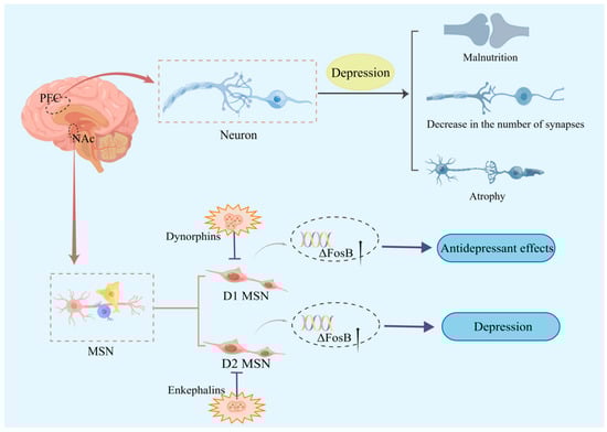 One of the two typical features of depression is a pleasure deficit, which is associated with reward system malfunction. The main projection neurons of the nucleus accumbens (NAc) are the middle spiny neurons (MSN), which play a significant role in regulating mood, motivation, and reward circuits. Interestingly, research suggests that activation of the dopamine receptor 1 (D1) MSN may promote antidepressant effects, while activation of the dopamine receptor 2 (D2) MSN exacerbates depressive symptoms [17]. One possible explanation is that this is due to differences in excitatory transmissibility in the NAc MSN subtypes. Dynorphins and enkephalins are neuropeptides present in both neurons, with dynorphins mainly present in D1 MSN, and enkephalins mainly present in D2 MSN [18]. Dynorphin levels in NAc increased [19], while enkephalin levels decreased [20] in a depressed animal model. Enkephalins may help depressed patients return to normal because their level is raised after antidepressants have been taken [21]. Furthermore, preventing the activation of dynorphins may have an antidepressant effect [22]. This alteration may have occurred because enkephalins hinder the augmentation of D2 MSN activity, while dynorphins prohibit D1 MSN from acting as an antidepressant. Moreover, it was demonstrated that the expression of the ΔFosB gene in the NAc of depressed patients is markedly diminished [23], and that it may mediate mice D1 MSN or D2 MSN-mediated adaptation to external stimuli (Figure 1). The D1 MSN of the more adaptable mice [24] and the D2 MSN of the less adaptable mice both showed increased ΔFosB expression. Second, overexpression of ΔFosB in D1 MSN enhanced AMPA receptor (AMPAR) GluR2 expression, which led to a quicker recovery from chronic social defeated stress (CSDS) depression in mice models [23].