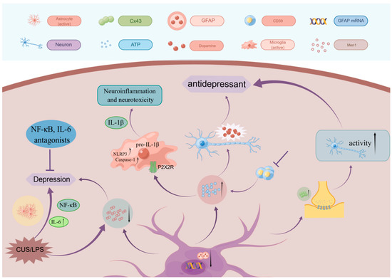 The neuroinflammatory response is a progressive and complex process, mainly manifested by the activation and proliferation of glial cells, the infiltration of peripheral inflammatory cells and the expression of related inflammatory cytokines. An increasing number of findings support the occurrence of typical neuroinflammatory alterations in depression, primarily in the form of microglia activation, which may also be accompanied by astrocyte activation and altered chemokine levels [45,46]. On the one hand, astrocytes exhibit anti-inflammatory effects by mediating signaling pathways like TGF-β, IFN-γ, and BDNF [47], while on the other, they have pro-inflammatory effects by mediating signaling pathways like TrκB, NF-κB, and VEGF. Leng et al. [48] demonstrated that the expression of multiple endocrine tumor type 1 (Men1) proteins was reduced in the brains of animals exposed to CUS or lipopolysaccharide (LPS), and that the decrease in astrocyte-specific Men1 proteins led to depression-like behavior. The study also discovered decreased Men1 and increased NF-κB activation and interleukin-1β (IL-1β) production in astrocytes. It further discovered depression-like behavior in mice could be improved by NF-kB inhibitors or IL-1b receptor antagonists. The idea that astrocyte-mediated neuroinflammation is related to the pathology of depression is supported by several investigations. LPS-induced astrocyte activation can lead to depressive-like behaviors that can be alleviated by suppressing astrocyte responses [49,50,51] (Figure 2).