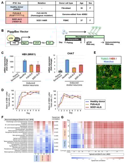 Generation of motor neurons from iPSCs. (A) Information about the iPSCs used in this study. (B) Experimental design of neuronal differentiation and analysis; (C) mRNA expression levels of motor neuron markers on day 7 were determined by qPCR. Each value represents the mean ± SEM (n = 3). (D) Induction efficiency for motor neurons was evaluated for days 1–9. Each value represents mean ± SEM (n = 16). (E) A representative image of healthy donor-derived motor neurons on day 7 immunostained for Tubb3 (green), HB9 (red), and Hoechst 33342 (blue). The scale bar represents 50 μm. (F) The transcriptome of induced motor neurons on days 7 and 14 were compared to each cluster of annotated neurons from the adult mouse scRNA-seq dataset [25]. (G) The transcriptome of induced motor neurons on days 7 and 14 was compared to that of the human spinal cord at each Carnegie stage [26].