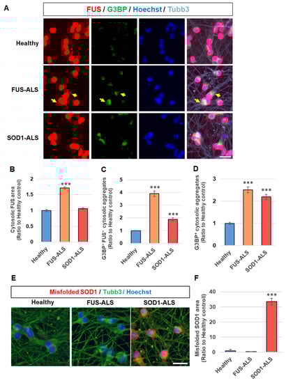 Evaluation of protein accumulation in the ALS neurons. (A) Representative images of iPSC-derived motor neurons immunostained for G3BP (green), FUS (red), Tubb3 (cyan) and Hoechst 33342 (blue) on day 14. Yellow arrowheads indicate the cytosolic FUS+ region. The scale bar represents 50 μm. Quantification of: (B) cytosolic FUS+ area; (C) FUS + G3BP+ cytosolic aggregates; and (D) G3BP+ cytosolic aggregates per cell. Each readout of FUS-ALS and SOD1-ALS neurons was normalized to that of the healthy control (n = 6, mean ± SEM). (E) Representative image of iPSC-derived motor neurons immunostained for Tubb3 (green), misfolded SOD1 (red), and Hoechst 33342 (blue) on day 14. The scale bar represents 50 μm. (F) Quantification of misfolded SOD1 area per cell. The misfolded SOD1 area of FUS- and SOD1-ALS neurons was normalized to that of the healthy control (n = 6, mean ± SEM). ***: p < 0.001 vs. healthy control (t-test).