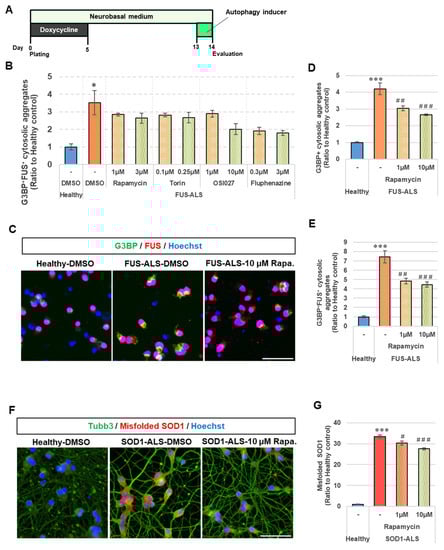 Effect of autophagy inducers on protein accumulation in ALS neurons. (A) Overview of the evaluation system for autophagy inducers. (B) The effect of autophagy inducers on FUS+ stress granules in FUS-ALS neurons was evaluated. Accumulation of FUS + G3BP+ cytosolic aggregates in FUS-ALS neurons was normalized to that of healthy control (n = 3, mean ± SEM). (C) Representative images of iPSC-derived motor neurons immunostained for G3BP (green), FUS (red), and Hoechst 33342 (blue). The scale bar represents 50 μm. The effect of rapamycin on (D) G3BP+; and (E) FUS + G3BP+ stress granule formation was evaluated. Accumulation levels of stress granules in FUS-ALS neurons were normalized to that of healthy controls (n = 5, mean ± SEM). (F) Representative images of iPSC-derived motor neurons immunostained for Tubb3 (green), misfolded SOD1 (red), and Hoechst 33342 (blue). The scale bar represents 50 μm. (G) The effect of rapamycin on SOD1 accumulation was evaluated. Accumulation levels of SOD1 in SOD1-ALS neurons were normalized to that of healthy controls. (n = 5, mean ± SEM). *: p < 0.05 vs. healthy control (t-test), ***: p < 0.001 vs. healthy control (t-test); #: p < 0.05 vs. vehicle control (Dunnett test), ##: p < 0.01 vs. vehicle control (Dunnett test), ###: p < 0.001 vs. vehicle control (Dunnett test).