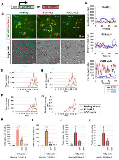 It has been suggested that increased cytotoxicity due to hyperexcitation may play a role in the pathogenesis of ALS. To determine whether the induced motor neurons were mature enough to show electrical activity, we first performed calcium imaging. jGCaMP7s and nuclear localization signal (NLS)-mCherry, expressed downstream of the Synapsin I (SynI) promoter (Figure 4A), were transfected into iPSCs to measure neuron-specific calcium concentrations. Regions of interest, including the cell body (ROI1–3) and cell-free region (ROI4) for background intensity calculation, were defined from the induced neurons on day 14 in each field of view (Figure 4B). All mCherry+ cells showed signal oscillation of GCaMP, which indicates spontaneous oscillations of intracellular calcium levels, and the amplitude-frequency tended to be higher in ALS neurons. (Figure 4C). To verify the electrophysiological function of the induced motor neurons in another assay system, we attempted to detect neuronal activity using multiple electrode array (MEA) recordings. iPSCs were seeded onto a plate with 16 electrodes per well. Neuronal induction was performed as described above (Section 2.1, Section 2.2 and Section 2.3), and MEA recordings were measured every two days until day 36. As the spikes of induced motor neurons were detected in all three iPSC lines around day 28, the differentiation of iPSCs into electrically mature neurons was considered successful. In addition, we found that FUS-ALS and SOD1-ALS neurons had significantly higher spontaneous firing rates than healthy neurons (Figure 4D–G). To validate the hyperexcitability observed in ALS neurons, we evaluated the effects of retigabine as a positive control compound [13]. On day 36, just before the end of the experiment, treatment with retigabine for 3 h inhibited hyperexcitation in ALS neurons in a dose-dependent manner (Figure 4H–K). Our induction method is also useful for evaluating neuronal hyperactivity.