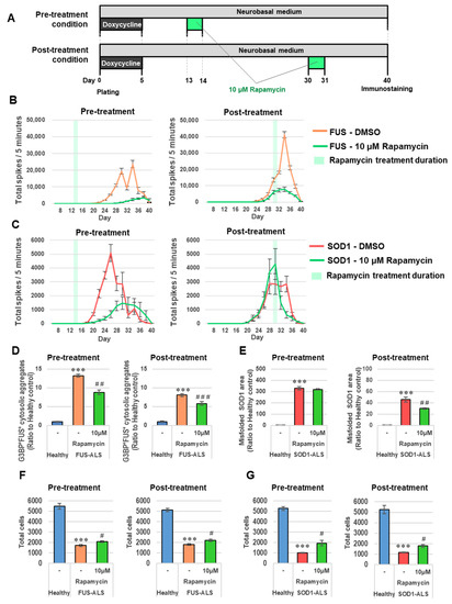 Effect of rapamycin on hyperexcitability in ALS neurons. (A) Overview of the scoring system for the effect of rapamycin on hyperexcitability in ALS-neurons. The number of spikes in (B) FUS-ALS; and (C) SOD1-ALS following pre-and post-treatment of rapamycin were evaluated from day 6 to 40. Each value represents the mean ± SEM (n = 4). The effect of rapamycin on (D) FUS stress granule formation in FUS-ALS; and (E) the accumulation of misfolded SOD1 in SOD1-ALS were evaluated on day 40. Each value was normalized to that of the healthy control (n = 4, mean ± SEM). The effect of rapamycin on the cell counts of (F) FUS-ALS; and (G) SOD1-ALS were evaluated on day 40. Each value represents mean ± SEM (n = 4). ***: p < 0.001 vs. healthy control (t-test); #: p < 0.05; ##: p < 0.01; ###: p < 0.001 vs. vehicle control (Dunnett test).