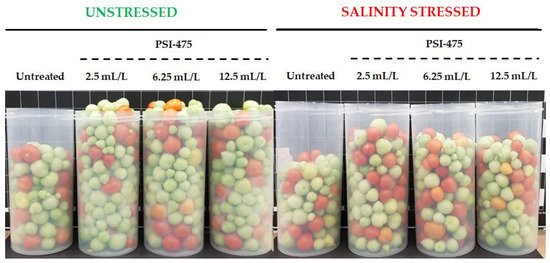 2.1. Effect of Salinity and PSI-475 Rate on Tomato Phenotypic and Fruit Yield Parameters