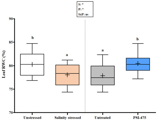 | Salinity stressed × PSI-475 | 2.37 | 5.48 b | 11.96 b | 3.06 b | 13.75 c |