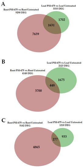 2.7. Differentially Expressed Genes (DEGs) in Young Leaf and Root Tomato Tissues