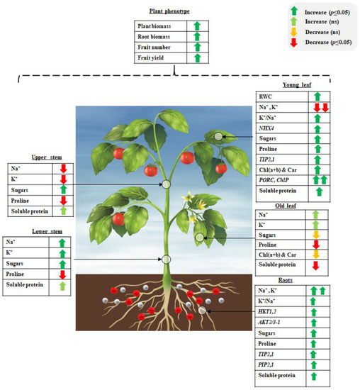 - Maach, M.; Baghour, M.; Akodad, M.; Gálvez, F.J.; Sánchez, M.E.; Aranda, M.N.; Venema, K.; Rodríguez-Rosales, M.P. Overexpression of LeNHX4 improved yield, fruit quality and salt tolerance in tomato plants (Solanum lycopersicum L.). Mol. Biol. Rep. 2020, 47, 4145–4153. [Google Scholar] [CrossRef]