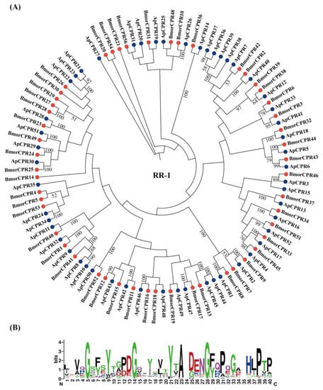 Phylogenetic relationship (A) and sequence logo of the conserved region (B) of RR-1 proteins from A. pernyi (Ap; blue circle) and B. mori (Bmor; red circle). The sequence logo was generated by Weblogo [].