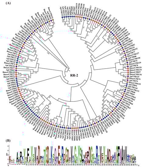 According to the phylogenetic analysis, we were able to assign orthologs to 34 of 51 B. mori RR-1 genes. It was shown that the homology of the RR-1 family is clear (Figure 2A). WebLogo analysis [] confirmed that RR-1 proteins in A. pernyi contain the conserved R&R Consensus region (GxFxYxxPDGxxxxVxYxADENGYQPxGAHLP) (Figure 2B). However, determining orthologs among RR-2 proteins was difficult, as only 31 of 84 B. mori RR-2 genes had clear 1:1 orthologs in A. pernyi (Figure 3A). The remaining RR-2 genes have no clear orthologous genes. Sequence logos generated from 176 RR-2 genes of A. pernyi and B. mori confirmed that RR-2 proteins in A. pernyi contain the conserved R&R Consensus region (EYDAxPxYxFxYxDxHTGDxKSQxExRDGDVVxGxYSLxExDGxxRTVxYTADxxNGFNAVVxxE) (Figure 3B). Some clades in RR-2 proteins showed multiple to multiple homologous relationships (co-orthologous groups) in our BLAST analysis (Table S4). We further compared these co-orthogonal groups with the results in [], and found that they corresponded to the gene clusters in B. mori and had specific locations on chromosomes (Figure 3A). For example, six genes (ApCPR113, 117, 118, 119, 120 and 121) clustered on the same chromosome chr18 were the most similar to BmCPR86–89. In Table S4, the similar homologous groupings are shown.