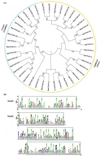Phylogenetic relationship (A) and domain organization (B) of CPAP1 and CPAP3 proteins in A. pernyi (Ap) and B. mori (Bmor). The pink clades represent the ChtBD2s for CPAP1 proteins; the purple clades represent the ChtBD2s for CPAP3 proteins. The sequence logo shows the conserved region of the CPAP proteins in A. pernyi. The protein with one Cx14–16Cx5Cx9–13Cx12Cx7–8C motif is CPAP1 and the one with three Cx13–24Cx5Cx9–10Cx12–16Cx7–8C motifs is CPAP3. The chitin-binding domains (ChtBD2) are represented by squares. The sequence logos were generated by Weblogo [].