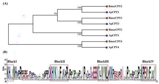 Four CPT genes with the Tweedle motif were identified in A. pernyi, as found in other lepidopteran species []. The four ApCPTs were found to be homologous to BmorCPT1-4 (Figure 5A). Sequence logos generated from eight CPTs of A. pernyi and B. mori revealed four well-conserved blocks (Figure 5B). Block I contained a KX2Y/F motif (where X2 represents two non-conserved aas), II showed a KX4-5FIKAP sequence, III had a TX2YVL motif and IV consisted of the KPEVYXFV/IKY sequence.