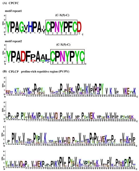 WebLogos of the CPCFC (A) and CPLCP (B) in A. pernyi. CPCFC sequences have two repeats of a motif ending in C-X5-C, and CPLCP sequences have the presence of a high density of PV and PY. The sequence logos were generated by Weblogo [].
