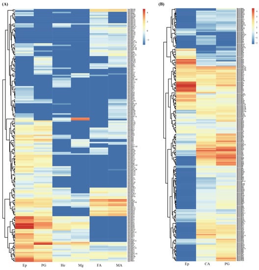 The expression profiles of CP genes in six tissues/organs of A. pernyi (A) and three tissues/organs of B. mori (B). Red indicates a high expression and blue indicates a low expression. The analyzed tissues/organs include the epidermis (Ep), prothoracic gland (PG), Haemolymph (He), midgut (Mg), female antenna (FA) and male antenna (MA).