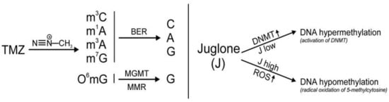 Mechanism of action of temozolomideTMZ and juglone BER-Base Excision Repair, MGMT-Methylguanine–DNA methyltransferase, MMR-Mismach Repair, DNMT-DNA methyl transferase, ROS-Reactive Oxygen Species.