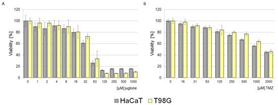The T98G and HaCaT cells were treated with increasing doses of juglone and TMZ in the range of 1–1000 and 1–2000 µM, respectively (Figure 3).