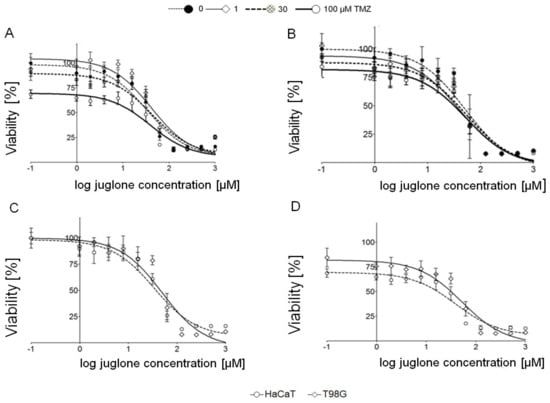 Juglone effect on (A) human keratinocyte (HaCaT) and (B) glioblastoma (T98G) cell lines alone and with TMZ. Cells proliferation was analyzed 24 h after supplementation with juglone (1–1000 μM, −1 to 3 in logarithmic scale) and TMZ (0, 1, 30, 100 μM). (C) Juglone concentration 1–1000 μM (−1 to 3 in logarithmic scale) without TMZ and (D) with 100 μM TMZ.