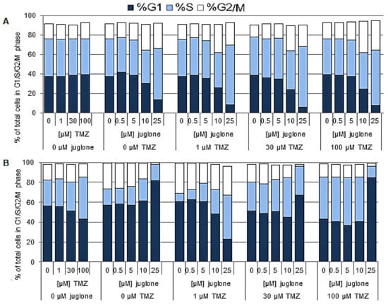 The effect of TMZ and juglone on the HaCaT (A) and T98G (B) cell cycle. The percentage of cells in each phase of the cell cycle is showed. All experiments were performed in triplicate.