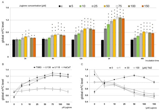 The effect of juglone on HaCaT, T98G, U138, and U118 cell lines was analyzed on the global m5C amount in cellular DNA. Because the m5C level is a very sensitive marker, we used three different glioma cell lines and lower concentrations of drugs. The total DNA methylation level was checked after treatment with 0–150 µM of juglone and 0–100 µM of TMZ (Figure 6B). All glioma cell lines show a similar global methylation pattern which is different from normal cells. We noticed concentration- and time-dependent changes in m5C contents. Global DNA methylation of the normal cell line (HaCaT) did not change significantly in the presence of an increasing concentration of juglone (Figure 6B). The highest values of m5C in DNA are observed for the T98G cell line and the incubation time of 24 h (Figure 6A).