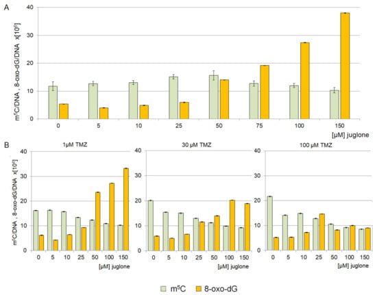 A total amount of the 8-oxo-dG in genomic DNA from the T98G cell line was analyzed after treatment with juglone. It can be seen that juglone at high concentrations induces a high increase in the level of 8-oxo-dG in DNA. At the same time, the m5C amount was on the same level (Figure 7A). However, the combination of juglone and TMZ concentrations of 1, 30, and 100 µM induced changes in m5C and 8-oxo-dG synthesis. Hypomethylation for all concentrations of TMZ is evident (Figure 7B). On the other hand, we observed an increase of 8-oxo-dG for 1 µM TMZ. Further increase of TMZ concentration causes a decrease of 8-oxo-dG, particularly at 100 µM of TMZ, which was expected. The decrease in the amount of 8-oxo-dG suggests the induction of DNA repair mechanisms.
