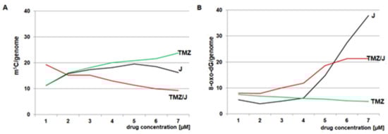 A longer incubation time (48 h) induces a decrease of the m5C content. This suggests that the demethylation process takes place. One can see that all doses of TMZ induce a lowering of the DNA (m5C) level, but juglone causes an apparent dose-dependent increase in genomic DNA methylation in the T98G cell line (Figure 6C). From that, it is clear that the effect of juglone and TMZ on the glioblastoma cell line depends on the concentration of both compounds.