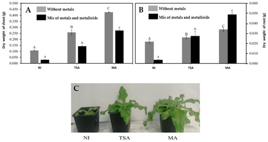 Dry biomass of shoots (A) and roots (B) of Mesembryanthemum crystallinum plants grown in the absence (grey bars) and presence (black bars) of a mixture of metals and metalloids (10 µM As + 1 µM Cd + 20 µM Cu + 50 µM Zn), non-inoculated (NI) or inoculated with TSA or MA SynComs. Data are means of 10 independent determinations ± standard deviations. Statistically significant differences with respect to the non-inoculated control plants at p < 0.05 are indicated by different letters (upper case for the plants grown in the absence of metals and lower case for plants grown in the presence of a mix of metals). (C) Aspect of inoculated vs. non-inoculated plants grown in the presence of metals.