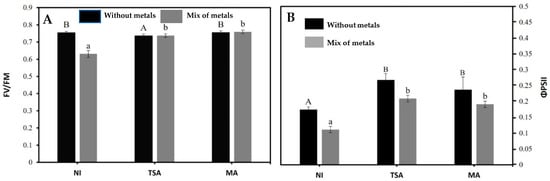(A) Maximum quantum efficiency of PSII photochemistry (Fv/Fm), and (B). Quantum efficiency of PSII (ΦPSII) of Mesembryanthemum crystallinum plants grown in the absence (black bars) and presence (gray bars) of a mixture of metals and metalloids (10 µM As + 1 µM Cd + 20 µM Cu + 50 µM Zn) and inoculated with TSA or MA consortiums. NI: non-inoculated control. Data are means of 7 independent determinations in 7 different plants ± standard deviations. Statistically significant differences with regard to the non-inoculated control plants at p < 0.05 are indicated by different letters (upper case for the plants grown in the absence of metals and lower case for plants grown in the presence of a mix of metals).