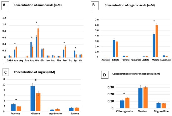 Concentration of amino acids (A), organic acids (B), sugars (C), and other metabolites (D) in the leaves of Mesembryanthemum crystallinum in the absence of metals (blue bars) and in the presence of a mixture of arsenic and metals (10 µM As + 1 µM Cd + 20 µM Cu + 50 µM Zn) (orange bars). Data are means ± standard deviations of three independent determinations. Statistically significant differences with regard to the control plants in the absence of metals are indicated by asterisks.