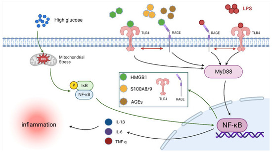 RAGE, another important receptor involved in the inflammatory response, can bind with various ligands, including advanced glycosylation end products (AGEs) [23], high mobility group box 1 (HMGB1) [24], and the S100A8/A9 heterodimer [25]. The ligands mentioned above are increased in the HG-induced inflammatory response [26,27]. HG induces significant upregulation of RAGE and its ligands, which then bind to RAGE to enhance RAGE oligomerization and further activate the cellular inflammatory signaling pathways [27]. Wang et al. [28] found that the use of RAGE-blocking antibodies effectively inhibited LPS-induced NF-κB activation in endothelial cells, suggesting that RAGE plays an important role in the LPS-induced inflammatory response.