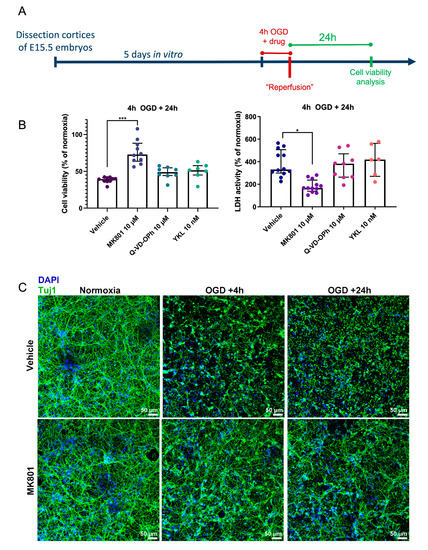 Since caspase activation requires ATP, apoptosis may not occur in the case of severe ATP depletion. Therefore, we reduced OGD duration to 2 h to investigate whether this would lead to more apoptosis and, thus, neuroprotection with anti-apoptotic drugs. Upon shorter OGD, MK801 was still the only significantly neuroprotective drug (Figure 3B).