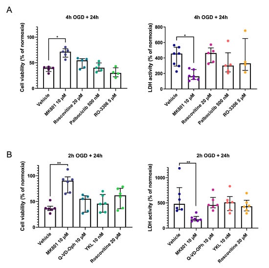 For OGD exposure, supplemented neurobasal medium was replaced with DMEM without glucose (Gibco, 11966025), and cortical neurons were transferred to an incubator with 1% O2, 5% CO2, and 94% N2. Control neurons were kept in supplemented neurobasal medium in an incubator with 5% CO2 and 95% air for the same period. After four (or two) hours, primary neurons were placed back in complete neurobasal medium and maintained in a standard CO2 incubator with 5% CO2 and 95% air for 24 h (Figure 1A). Control and OGD-exposed cells were incubated either with an inhibitor or 0.1% DMSO. Inhibitors were MK801 (Tocris, 0924, Ellisville, MO, USA), Q-VD-OPh (Sigma, SML0063), YKL-5-124 (MedChemExpress, HY-101357B, Princeton, NJ, USA), roscovitine (Selleckchem, S1153, Houston, TX, USA), palbociclib (Selleckchem, S1116), RO-3306 (AdipoGen, AG-CR1-3515-M005, San Diego, CA, USA), 3-methyladenine (3-MA; Selleckchem, S2767), or necrostatin-1 (AdipoGen, AG-CR1-2900-M005). After 2 or 4 h, cells were placed back in the complete neurobasal medium and maintained in a standard CO2 incubator with 5% CO2 and 95% air for up to 24 h. Each experiment on wild-type neurons was replicated at least four times, meaning that at least four independently obtained batches of primary cortical neurons were used, each obtained from the embryos of a different pregnant mouse. Every biological replicate (corresponding to one dot on the graph) in turn consisted of four technical replicates (four separate wells with cells from the same batch).