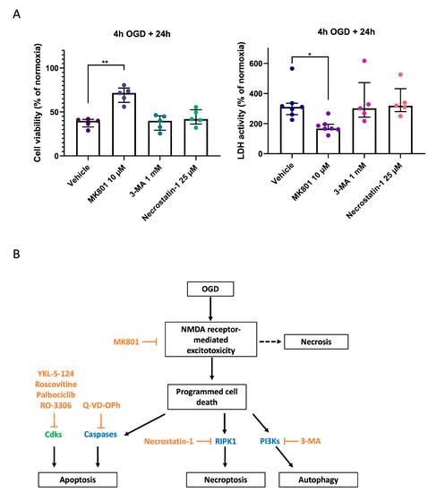 Pharmacological inhibition of autophagy and necroptosis does not prevent neurons from dying in response to OGD. (A) Viability of primary cortical neurons exposed to 4 h of OGD in the presence of either vehicle only (0.1% DMSO), MK801 (an NMDA receptor antagonist), 3-MA (an autophagy inhibitor), or necrostatin-1 (an inhibitor of necroptosis). Viability was measured with the CCK8 assay (left), while cytotoxicity was quantified using the LDH assay (right). Values are expressed as a percentage of the normoxia condition, measured 24 h after the end of OGD. Each dot represents the mean value of 4 replicates for a unique batch of primary cortical neurons (each batch is obtained from a separate pregnant mouse). Groups were compared using Kruskal–Wallis test with Dunn’s multiple comparisons test. Error bars: interquartile range. * p ≤ 0.05; ** p ≤ 0.01. (B) Scheme of the hypothetic pathways involved in neuronal cell death following OGD.