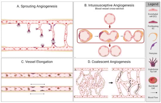 Angiogenesis is the process of forming new blood vessels out of pre-existing capillaries, driven by the requirement of oxygen []. There are several forms of angiogenesis as shown in Figure 1 and its accompanying Table 1. New blood vessels can be generated by; (1) sprouting angiogenesis, (2) intussusceptive angiogenesis, (3) vessel elongation, and (4) coalescent angiogenesis [,,,]. In sprouting angiogenesis, vessels grow from existing vessels by initiation of specialized endothelial cells (ECs), known as tip cells. With intussusceptive angiogenesis, the vessel splits into two daughter vessels [,,,]. Vessel elongation (or remodeling) involves passive cell growth as the vessel widens or extends by proliferating ECs [,]. Recently, a fourth form of angiogenesis has been introduced, coalescent angiogenesis. Coalescent angiogenesis is described as the process of the fusion (or coalescence) of an isotropic capillary mesh into a new extended vessel by parallel processes of vessel maturation and regression. In contrast to sprouting, coalescent angiogenesis can result in fast extension of the primary vessels while preserving perfusion. In addition, it seems that this form of angiogenesis does not need hypoxic triggers, can increase blood flow, and may even result in a decreased or unchanged capillary density [,]. A separate angiogenic mechanism is mediated through the embodiment of circulating endothelial progenitor cells in the existing vessel wall, contributing to sprouting angiogenesis, intussusception, and elongation [,].